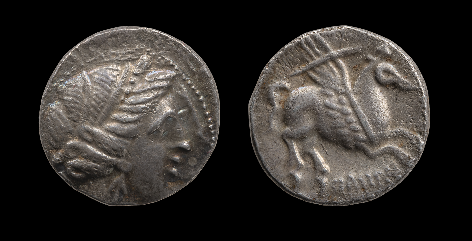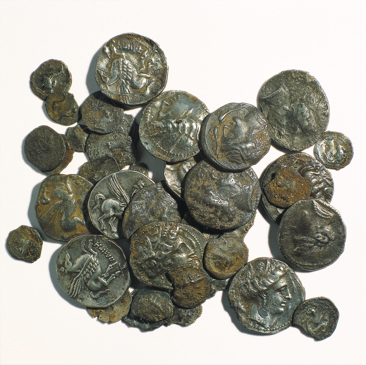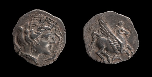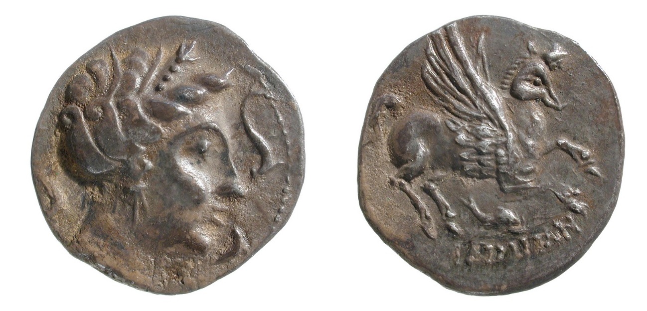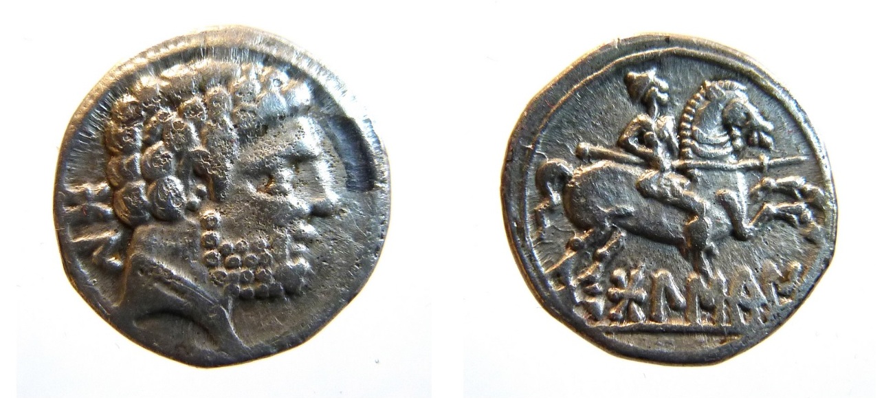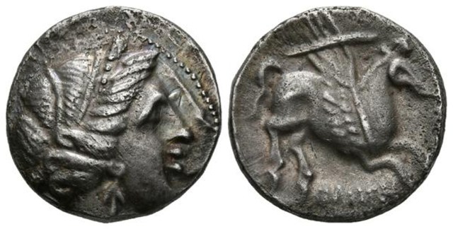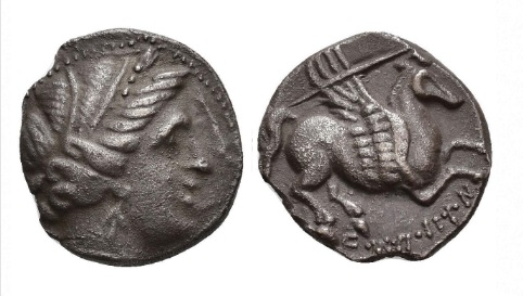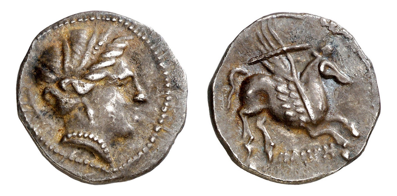 - 1 dracma de imitación muy tosca, con cabeza de anverso y pegaso de reverso ambos mirando a izquierda, y leyenda parcialmente visible OKu (nº 41).
