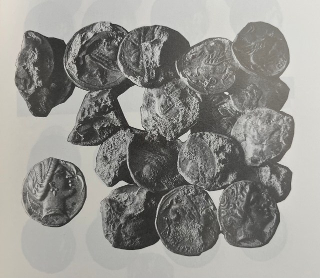De los nueve ejemplares que no pudo fotografiar sólo sabe que 4 de ellos probablemente eran dracmas ibéricas (uno con leyenda Emporiton), 2 denarios romanos republicanos, 1 quinario romano, 1 óbolo de leyenda KuM, y 1 divisor imitación massaliota tipo rueda con M-A-Creciente.