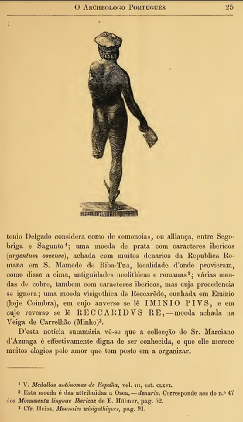 La historia de este tesorillo es la siguiente. José Leite de Vasconcellos (1858-1941) fue un erudito portugués interesado especialmente por la etnografía, la filología, la numismática, y «una de las mayores autoridades que en Arqueología ha producido la Península Ibérica» para A. García y Bellido. En «O Archeólogo Português«, revistas de la que fue fundador, nos da cuenta (p.p. 20-25) de su visita en Diciembre de 1892 a la colección de M. Azuaga.