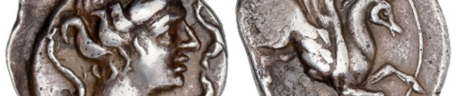 El ejemplar que presentamos procede de la subasta Soler & Llach on-line del 01/12/21 y presenta en su anverso una cabeza femenina (Artemis) de pequeño tamaño y de estilo romanizado rodeada de tres delfines, y en su reverso un pegaso con la cabeza modificada (crisaor), sin ningún símbolo, y debajo la inscripción griega parcialmente visible (emp)oriton. Tras un fructífero (y divertido) trabajo de investigación hemos conseguido obtener la trazabilidad del mismo: Se desconoce a qué hallazgo correspondería, pero sabemos que Villa Sivill fue su primer propietario conocido y que luego pasó a formar parte de la colección de Antonio M. de Guadán.