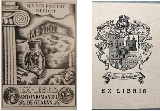 Conocemos el ex libris con el que este numísmata marcaba los libros de su biblioteca, y albergamos la sospecha de que llegó a utilizar otro distinto, no sabemos si antes o después, basándonos en algunos indicios. El primer ex libris aquí fotografiado viene en el libro «La Córdoba hispano-romana y sus monedas» de Chaves Tristán (gentileza de nuestro amigo Numisma) y el segundo en el «Catalogue des Monnaies et des medailles Antiques…» que es el catálogo que elaboró A. Delgado en 1857 para la venta de la colección Lorichs, ahora en nuestra biblioteca. Como vemos, este segundo ex libris lleva el mismo lema en latín, «el que no avanza, retrocede», que el primero, en el que no hay duda pues figura su nombre. No es una leyenda habitual, por lo que se trata de una coincidencia interesante. Pero es que además, aunque no hemos podido identificar el escudo heráldico, el escudete central sí que es el de la casa imperial de Láscaris-Comneno (del resto sólo podemos decir que la cruz es la denominada Cruz de Occitania y, bajo ella, el castillo que representa Castilla), lo que da una pista importante de que seguramente se trate del mismo propietario.