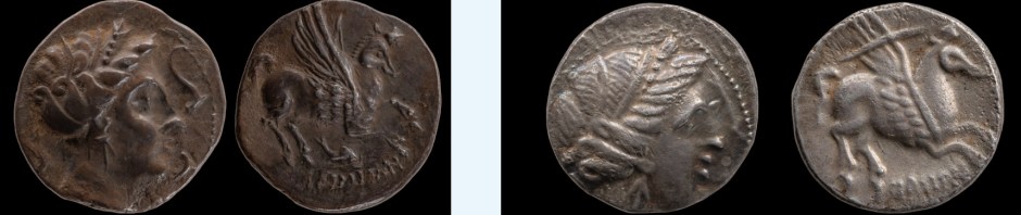 Actualmente, siguiendo la clasificación MIB, se trataría del MIB 1/213b, y concretamente este ejemplar es el Id 74786. Los reversos pueden presentar el símbolo de un delfín (como es el caso) o no (siendo entonces MIB 1/213a), pero ambos enlazan con cuños de anverso. Precisamente, el elevado número de enlaces entre los cuños de anverso (7 cuños conocidos) y de reverso (10 conocidos), indicarían una emisión corta en el número y en el tiempo (Villaronga, 2003, p 48-49). Es evidente la diferencia, aunque con alguna excepción, entre los reversos que portan el delfín de los que no lo llevan: la cabeza modificada del Pegaso es estilizada en éstos y muy realista en aquéllos. Pero es precisamente el enlace de cuños de anverso con ambos tipos de reverso lo que descarta la posibilidad de dos talleres o dos emisiones distintas.